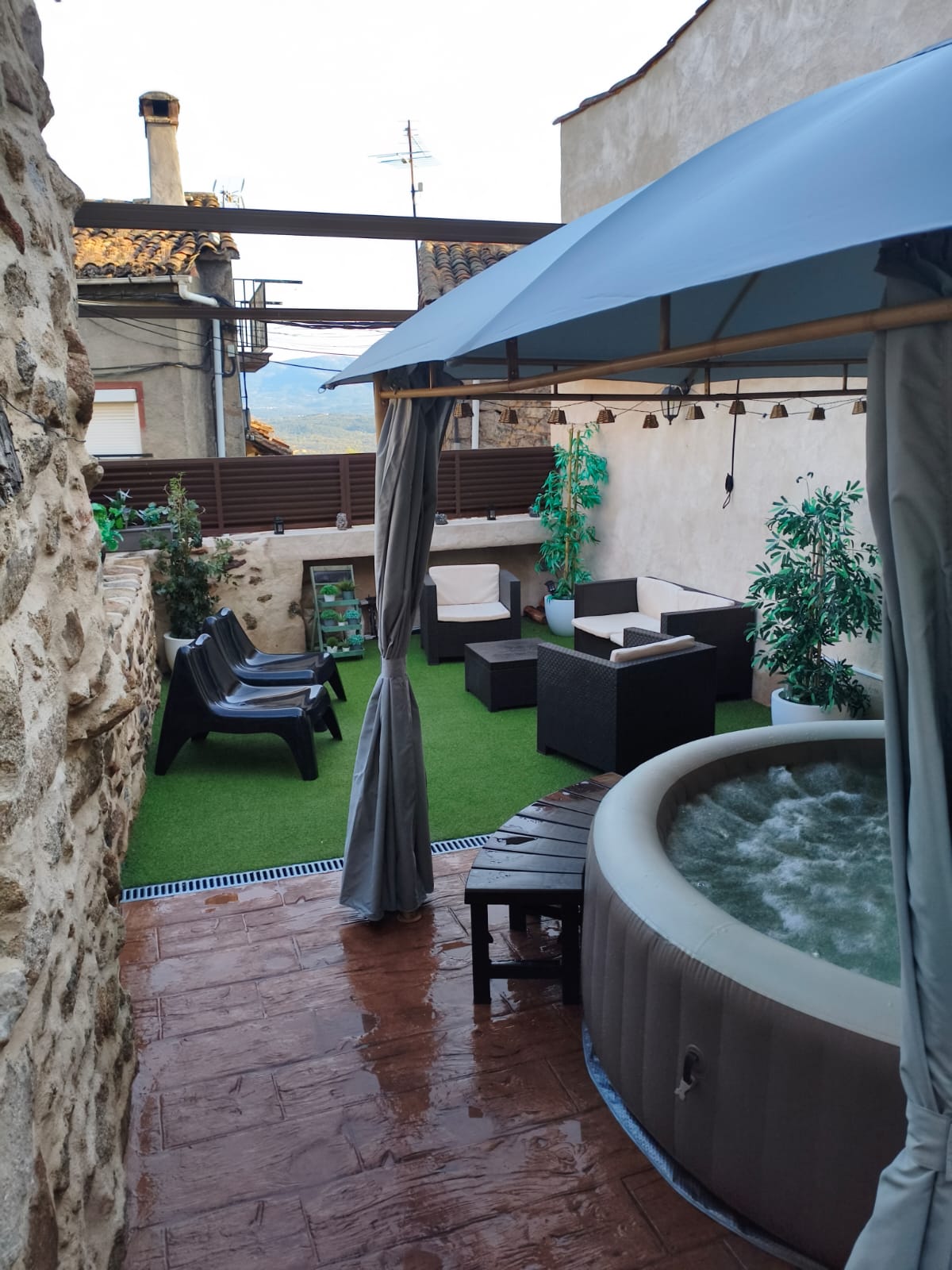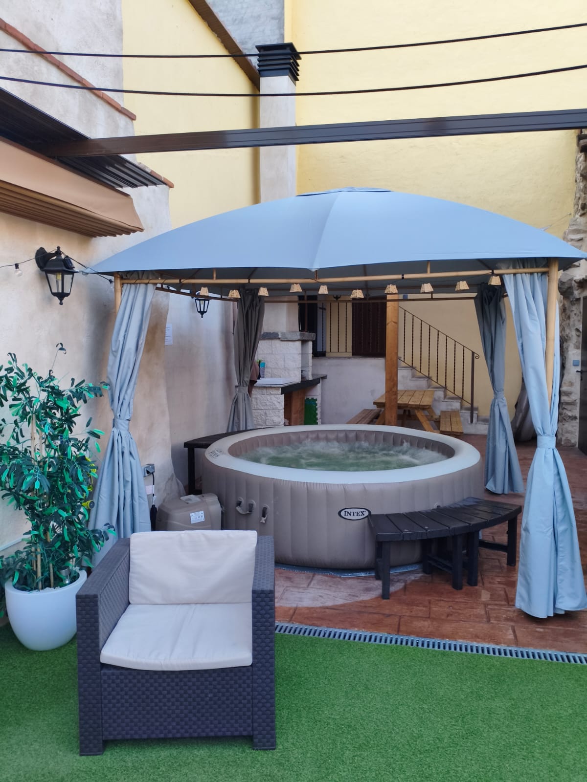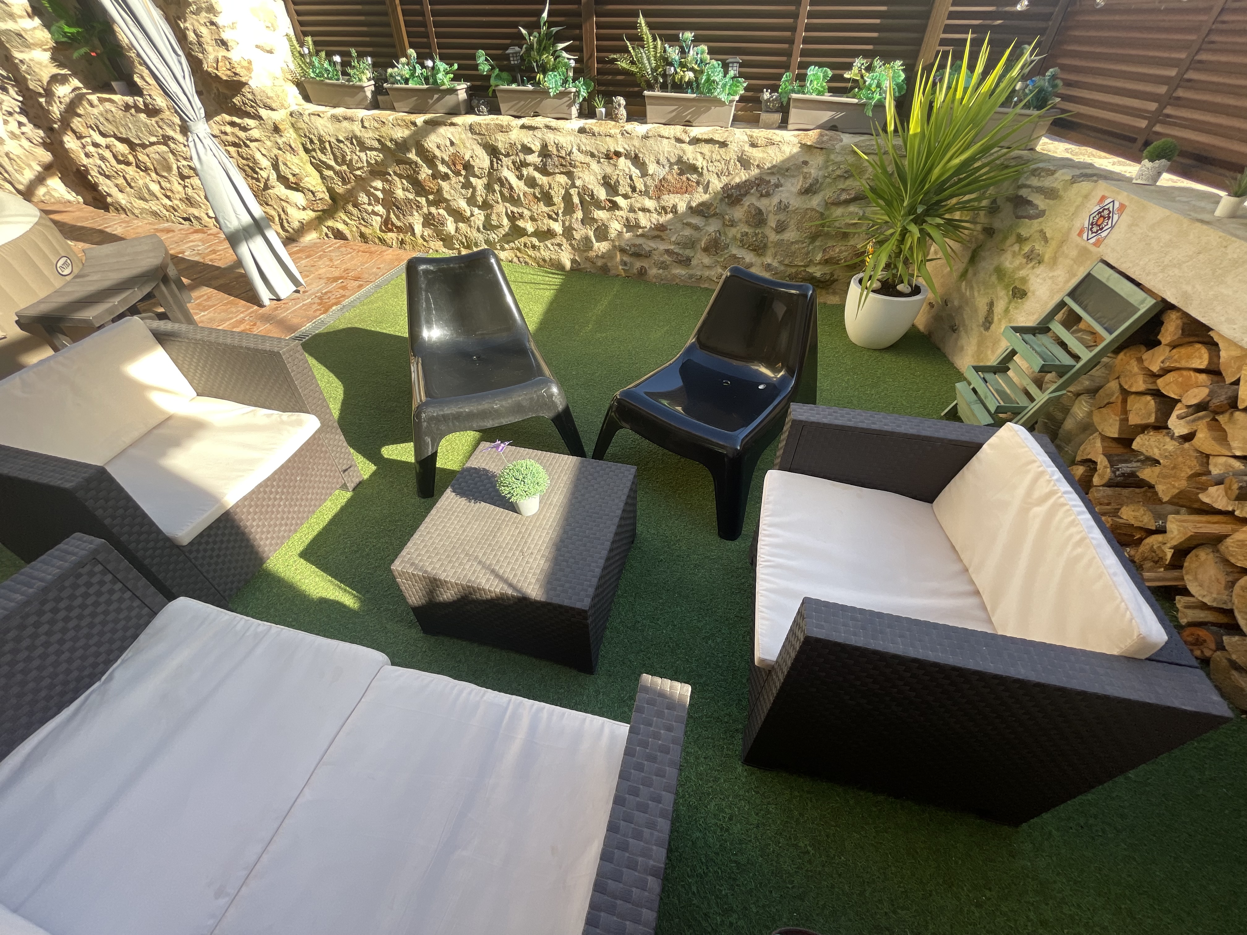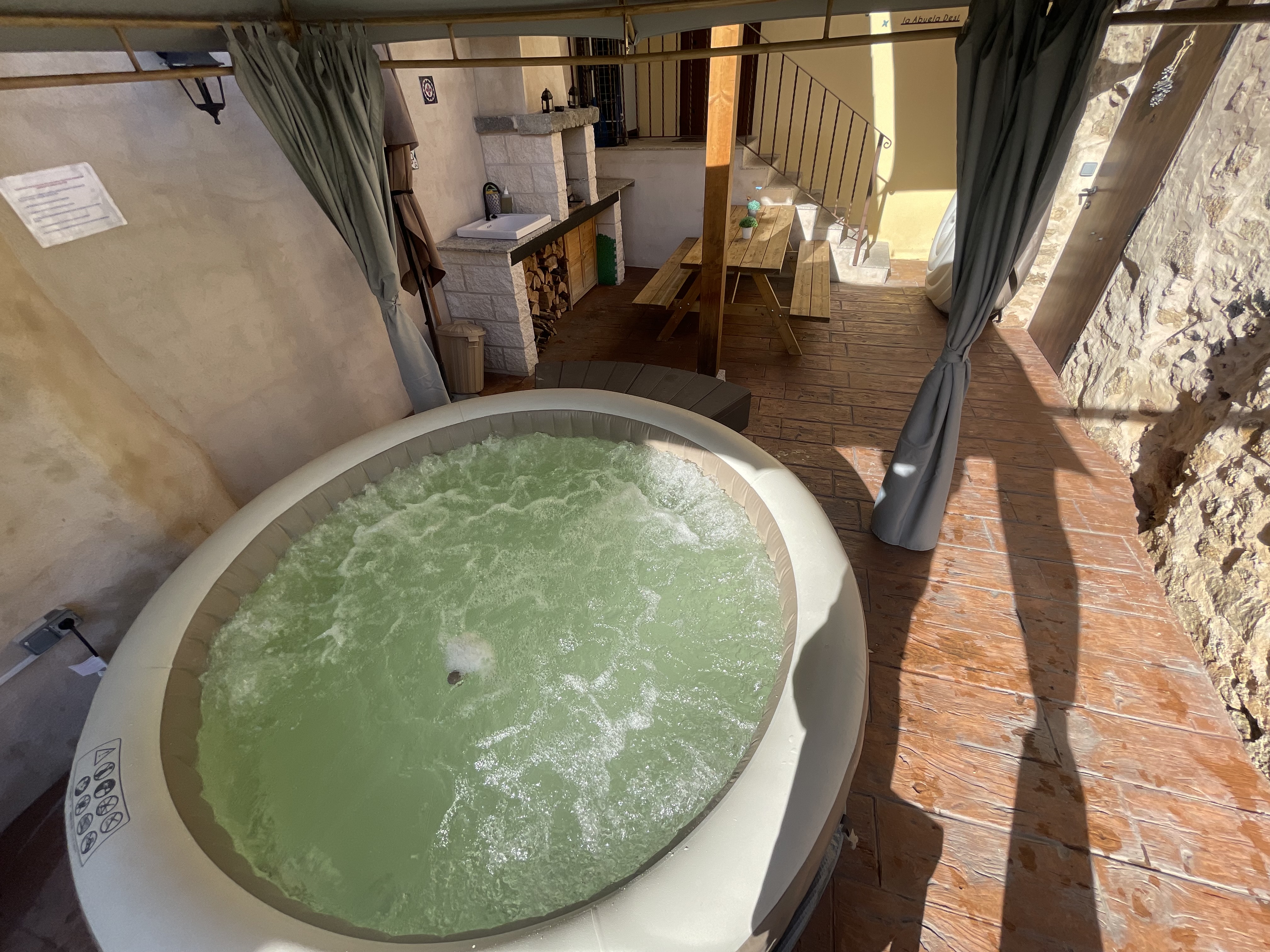 Descubre nuestro encantador patio, un refugio de paz con jacuzzi y barbacoa. Dispone de una sala de estar, cocina y una chimenea . Un espacio perfecto para relajarte, leer un buen libro o compartir momentos inolvidables. ¡Te esperamos para una experiencia única!